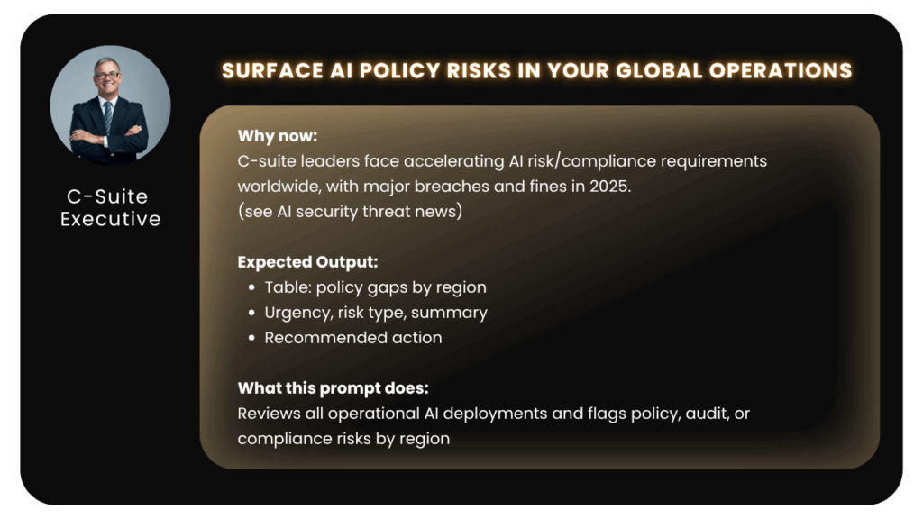 The function of this prompt block is to help C-suite leaders proactively manage AI risk by scanning global operations for compliance gaps and generating a prioritized risk table.