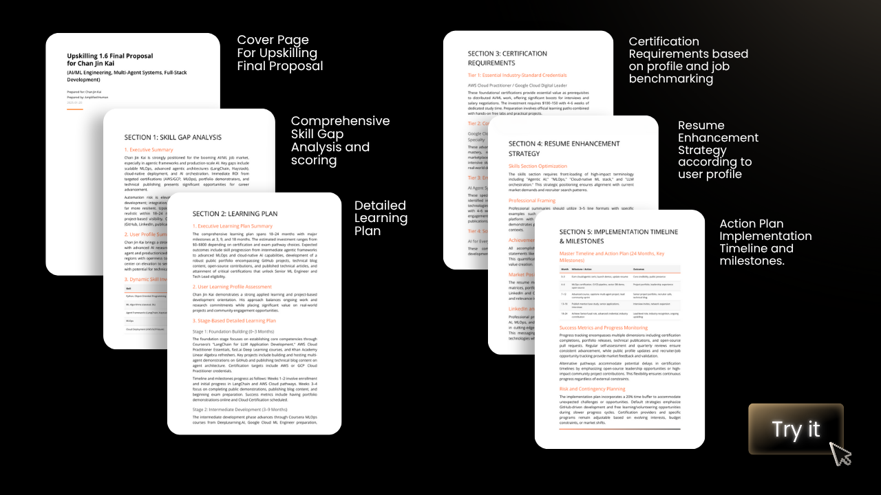 It is an AI agent on our Amplified Human platform that takes your resume, the role you want to work in, then it benchmarks against industry standards, collects relevant information, and reports back to you with a personalized upskilling roadmap, a skill gap analysis and an actionable progress timeline.