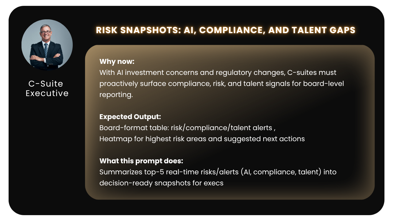 OBJECTIVE: Summarize top-5 real-time risks/alerts in AI, compliance, and talent into decision-ready snapshots for C-suite and board reporting.